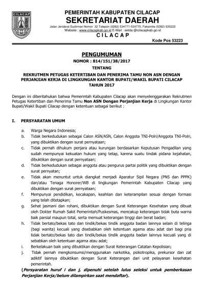 Negeri sipil (cpns) badan nasional pencarian dan pertolongan tahun anggaran 2021. Sementara instansi pemkab yang membuka lowongan cpns 2021 terbanyak meliputi. Pengumuman hasil sanggahan pelamar cpns pemkab cilacap. Pelamar cpns 2021 yang dinyatakan lulus bisa melanjutkan proses ke tahap ujian seleksi kompetensi bidang atau disebut skb cpns. Persyaratan umum untuk mengikuti seleksi cpns pemkab cilacap 2021.